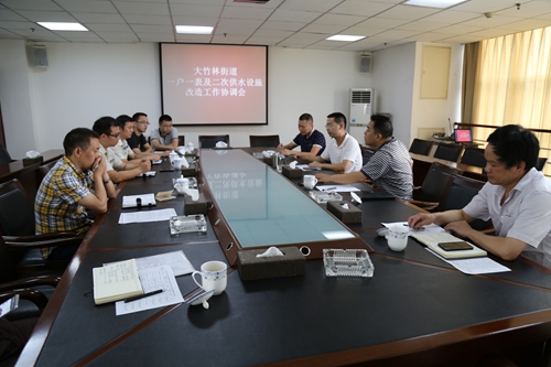 7月23日下午,北部新区市政局副局长与设施处主任到大竹林街道协调一户一表及二次供水设施改造工作,街道谷正义副主任参加,街道市政园林绿化环卫所、汪家桥社区、紫竹苑社区、龙湖江与城物管参会。
