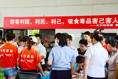 活动现场,紫竹苑社区工作人员和派出所民警向过往学生发放宣传资料、彩页及印有禁毒标志的遮阳伞、水杯共计1500余份,悬挂横幅6条,设立行架1个、展架2个,教育引导学生要远离毒品,珍爱生命,健康成长。
